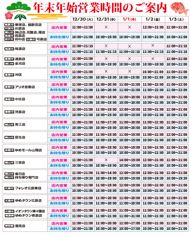 - 12/30(火)~1/3(土)の期間中にお渡しする「お持ち帰り寿司」のご予約は12/28(日)迄です。